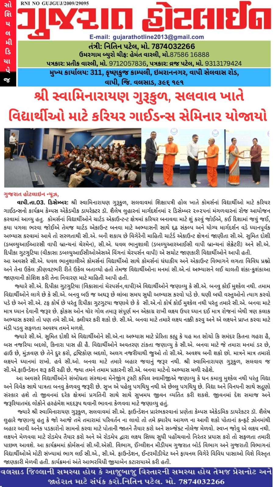 શ્રી સ્વામિનારાયણ ગુરુકુળ ,સલવાવ ખાતે વિદ્યાર્થીઓ માટે કરિયર ગાઈડન્સ સેમિનાર યોજાયો