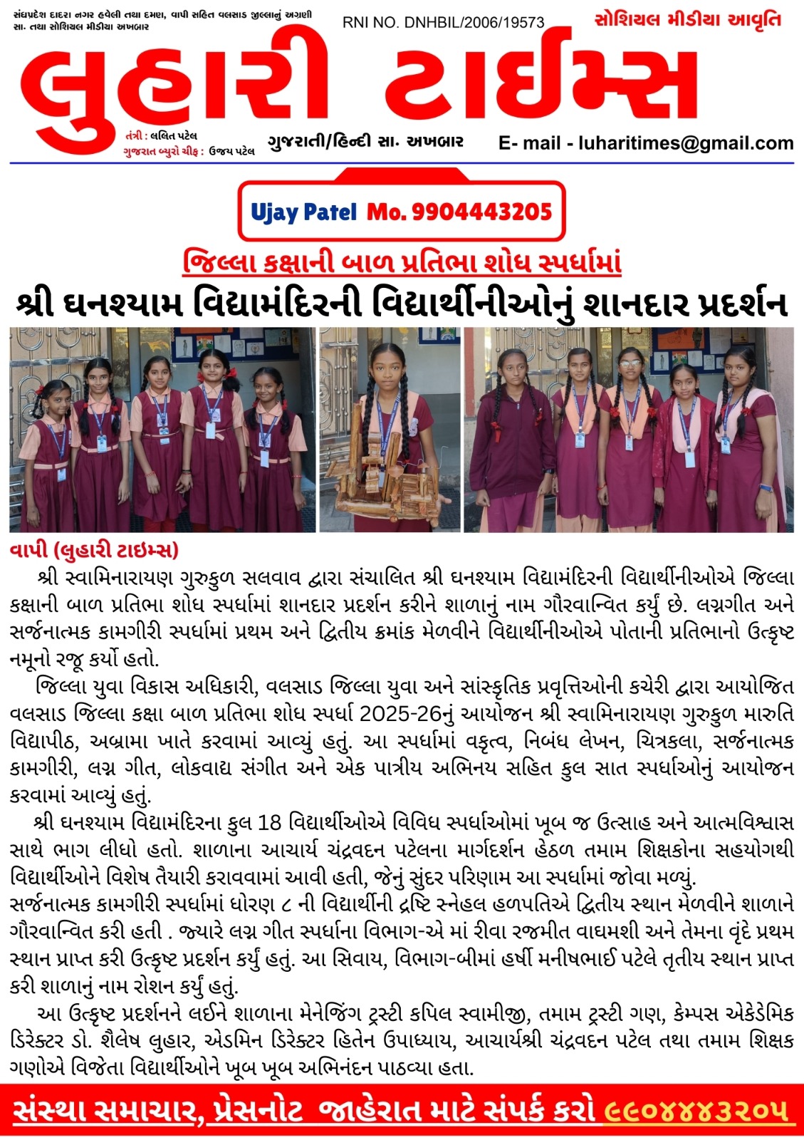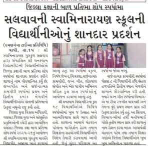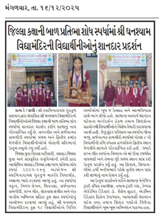 શ્રી ઘનશ્યામ વિદ્યામંદિર ,સલવાવની વિદ્યાર્થીનીઓનું જીલ્લા કક્ષાની બાળપ્રતિભા શોધ સ્પર્ધામાં શાનદાર પ્રદર્શન